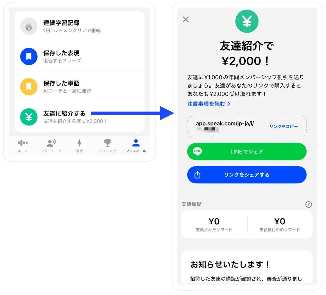 実はスピークには、家族や友達を紹介するとめちゃくちゃお得になる紹介制度があるんです。これを使えば、金銭的なハードルもグッと下がりますよ♪