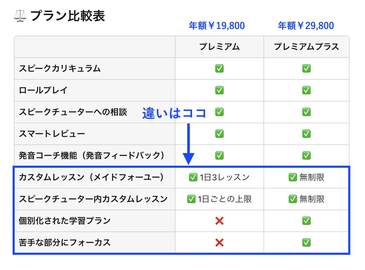 そこが迷うポイントだよね!でも大丈夫。基本の「デイリーレッスン」はどちらのプランでも無制限だし、カスタムレッスンも「プレミアム」で毎日しっかり体験できるから安心して^ ^