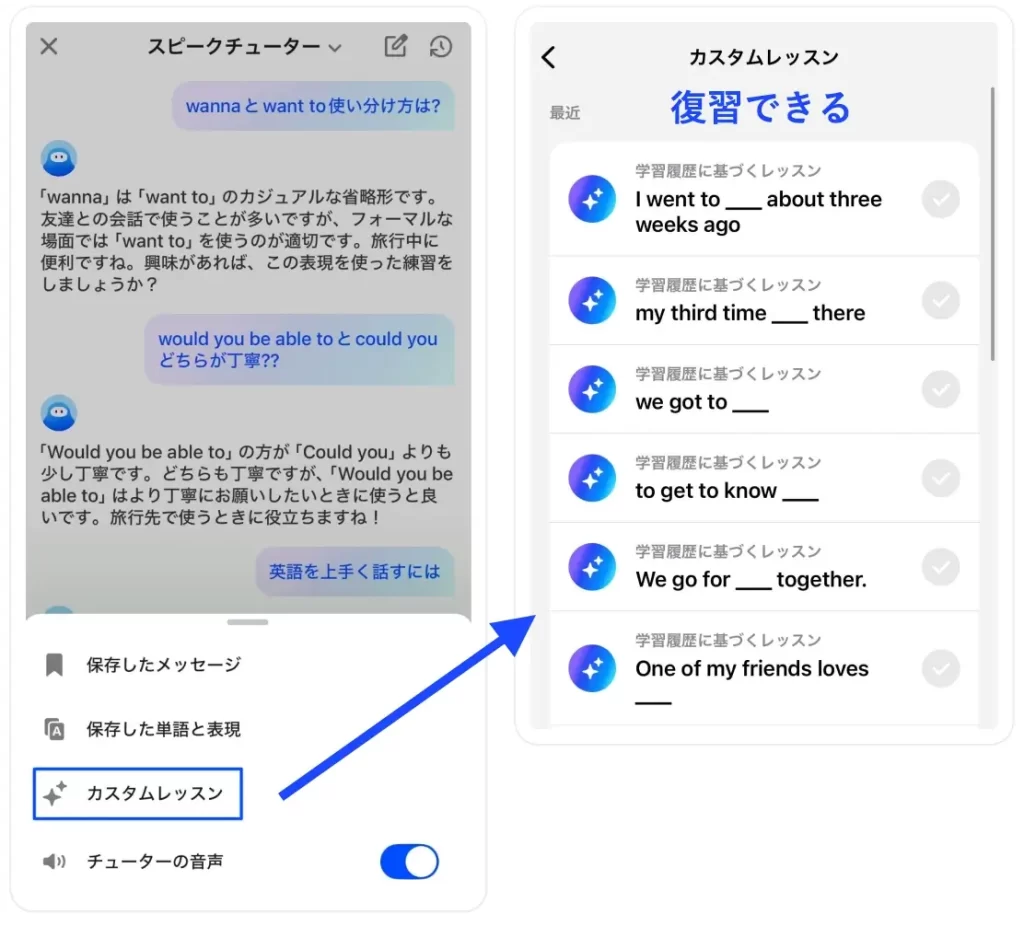 「スピークチューター」とは、いつでもあなたの学習をサポートしてくれる、専属のAI学習コーチのこと!「この文法って合ってる?」と質問したり、単語ゲームで息抜きしたり、自分のレベルにぴったりのスピーキング・レッスンを作ってくれるんです。