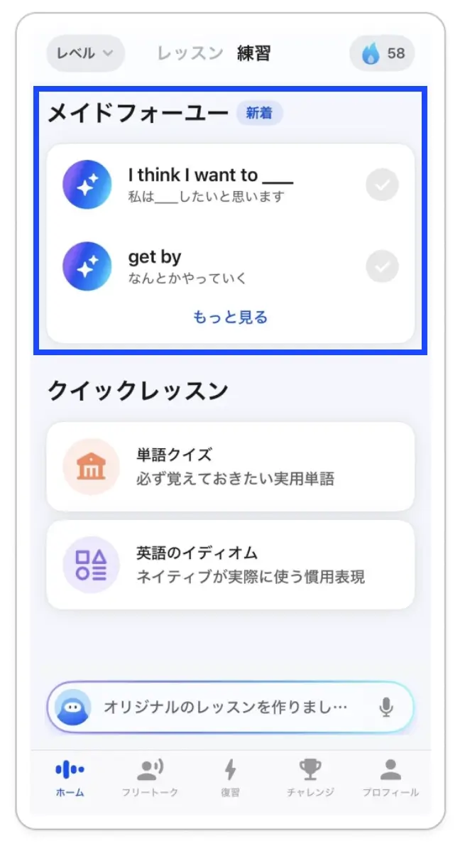 スピークの「カスタムレッスン(メイドフォーユー)」というのは、AIがあなたの英語レベルに合わせて、専用のスピーキングレッスンを自動で作ってくれる機能のことです。